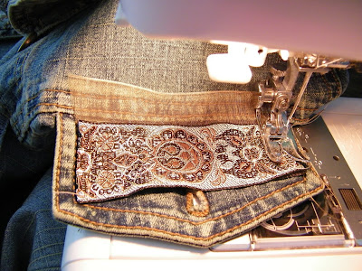So yesterday when I was at Joanne's Fabrics, as I walked by the rows of buttons and trims I got sucked in. They were so cool...I love buttons! Hmm..I picked out some pale blue lace admiringly, grabbed some more trim and ended up looking at the beautiful buttons and my jean jacket popped into my head.I thought I'm going to revamp my cool jean jacket I bought 3 years ago in Jackson Hole...